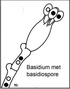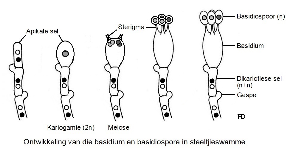 Eerstens sal die twee haploïede kerne (n) versmelt om ‘n diploïede kern (2n) te vorm. Die versmelting van die twee kerne word kariogamie genoem. Die hele diploïede toestand duur net vir ‘n kort rukkie voordat die diploïede kern deur meiose verdeel om vier haploïede kerne te vorm. Terselfdertyd ontstaan daar vier buisagtige sterigmata op die bopunt van die basidium.