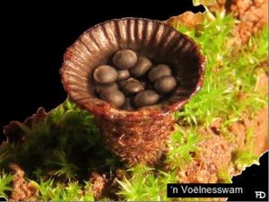 Die Voëlnesswamme hoort aan die Familie Nidulariaceae. Hulle is hoofsaaklik saprofities en groei diwels op hout. Die vrugliggaam, of peridium, is ‘n koppievormige struktuur wat maar 5-15 mm wyd is. Binne die koppie is daar van een tot verskeie lensievormige (1-3 mm groot) peridiole wat soos klein eiertjies binne die peridium lê. Basidia en basidiospore kom binne elke peridool voor. Die peridole word versprei deur reëndruppels wat hulle tot 1 m ver uit die peridium laat opskiet. Sommige het ‘n taai stert, die funikulêre koord, onderaan wat uit sy beskermende sakkie bars wanneer die peridool deur die reëndruppel getref word. Hierdie stert wat agter die bewegende peridool aanwapper plak teen die eerste beste oppervlakte so in die vlieg vas. Dit veroorsaak dat die peridool in die rondte al om en om die voorwerp, soos ‘n takkie of blaartjie of stingel, draai tot dit teenaan die nuwe oppervlakte lê – reg om deur ‘n herbivoor ingesluk te word. Die spore sal met die mis uitgeskei word en die swam sal sy lewensiklus voortsit.