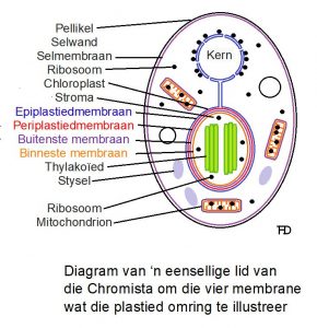 Die plastiede in bruinwiere is net soos die res van die Chromista s’n deur vier membrane, wat in chemiese samestelling verskil, omring. Lees Chromista 1: Inleiding om uit te vind hoe hierdie vier membrane ontstaan het. In kort: die plastiede in Chromista is afkomstig deur die ingestie van rooiwiere deur die Chromista se voorouer tydens voeding. Die rooiwier het in plaas van om deur die verteringsensieme van die Chromista voorouer verteer te word, endosimbioties in die gasheer-sel bly voortbestaan. Die gasheer trek uiteraard voordeel uit hierdie simbiotiese samesyn deurdat dit voedingstowwe, wat deur die plastied deur middel van fotosintese, ontvang.