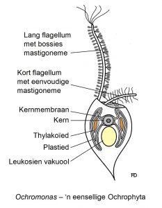 Die soöspoor het twee tipes flagella – vandaar die naam Heterokonta. Die een flagellum is sweepagtig terwyl die ander in meestal soos ‘n borseltjie lyk of op ander maniere van die eerste verskil. Eensellige heterokonta soos Ochramonas lyk baie soos die soöspore van bruinwiere (sien Chromista 3: Waterskimmels vir ‘n voorbeeld van ‘n soöspoor). ‘n Interessante verskynsel is dat brakwater-lewende bruinwiere hoofsaaklik ongeslagtelik deur middel van soöspore voortplant.