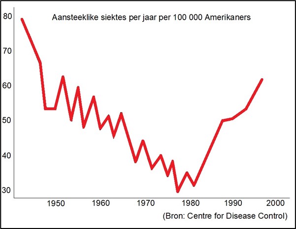 En toe was almal verkeerd – selfs die voorste viroloë was verkeerd. Aansteeklike siektes het vanaf die ontwikkeling van antibiotikas en inentings afgeneem tot en met die 1970’s… maar toe het daar onverwags van die ergste aansteeklike siektes hul opwagting gemaak. Dit was maar net die begin, want die verskyning van hierdie nuwe aansteeklike siektes het eksponensieël begin toeneem. Talle siektes het teen ‘n ongeëwenaarde tempo uitgebreek – 30 nuwe siektes het in 30 jaar uit die bloute verskyn. Daar is tans soveel nuwe siektes, wat oor die laaste paar dekades verskyn het, dat daar vir die eerste keer inrigtings en departemente by mediese skole is wat in Nuwe Aansteeklike Siektes (Emerging Infectious Diseases) spesialiseer.