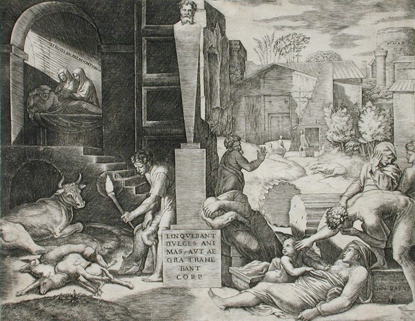 Il Morbetto (die plaag) deur Marcantonio Raimondi (1515-1516) (let op die nabyheid van die diere en die mense)