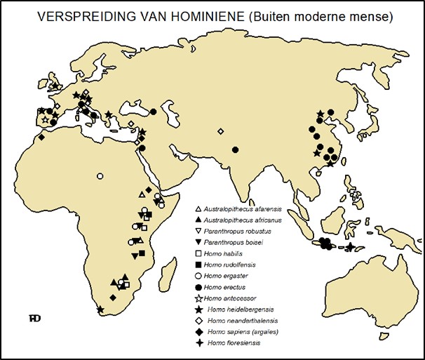 Gelukkig is dit maklik, weens hulle relatiewe jong ouderdom, om hulle genetika met moderne mense s’n te vergelyk. Volgens die genetiese inligting, verpreiding en datering van die fossiele dui dit daarop dat Homo sapiens in Afrika ontstaan het en van daar na die res van die wêreld versprei het. En omdat hierdie onderwerp baie mense wat ek ontmoet fassineer noem ek dit hier – ALLE hominiene wat in Afrika ontstaan het en dié wat uit Afrika gekom – Homo ergaster, Homo heidelbergensis en Homo sapiens was swart. Dit is net soos mense van Afrika, Indië en Australië, alhoewel hulle nie naasverwant is nie, vandag swart is – elkeen van hierdie groepe het onafhanklik swart velle ontwikkel en daar is verskillende gene daarby betrokke. Die enigste manier hoe mense in tropiese en subtropiese gebiede kan oorleef is as hulle donkervellig is om te verhoed dat hulle soos blankes in Afrika en Australië velkanker kry. Homo neanderthalensis was die eerste witvellige mensspesie sover ons weet en interessant genoeg – noordelike Homo sapiens rasse het nie hulle wit velle van Homo neanderthalensis weens intelery van hulle geërf nie, maar dit onafhanklik ontwikkel.