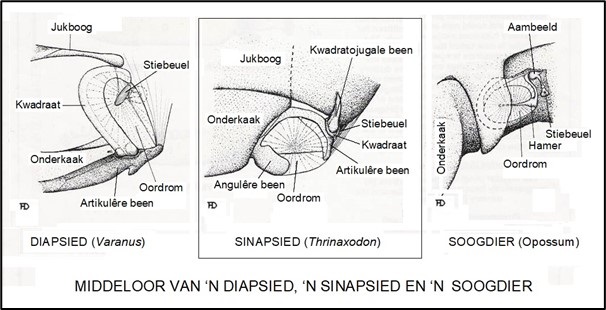 Weereens gee die fossiele van die sinapsiede die antwoord. Aanvanklik het die sinapsied onderkaak baie soos dié van ander reptiele s’n gelyk. Hulle onderkake het sewe bene (die dentale, spleniale, angulêre, koronoïed, surangulêre, artikulêre en pre-artikulêre bene) weerskante gehad. Soos wat die vleisvretende sinapsiede mettertyd meer soogdieragtig geword het, het die tand-draende (dentale) been algaande groter geword en die kaak-skarnierbeentjies en ander kaakelemente het dermate kleiner geword.