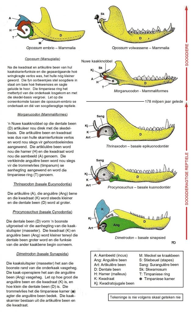 Met die ontstaan van die soogdiere, ongeveer 190 miljoen jaar gelede, het die tanddraende been (die dentale been) uiteindelik al die ander bene, wat in die reptielonderkaak voorkom, verplaas. Die twee kaakskarnierbeentjies (die artikulêre en kwadraat beentjies), wat lankal reeds ‘n rol in klankoordraging gespeel het, het terselfdertyd in die twee gehoorbeentjies ontwikkel wat ons die hamer (malleus) en aambeeld (incus) noem.