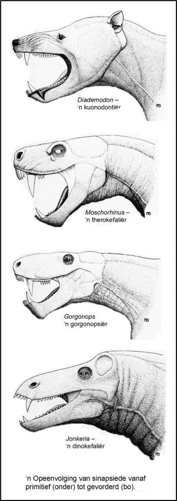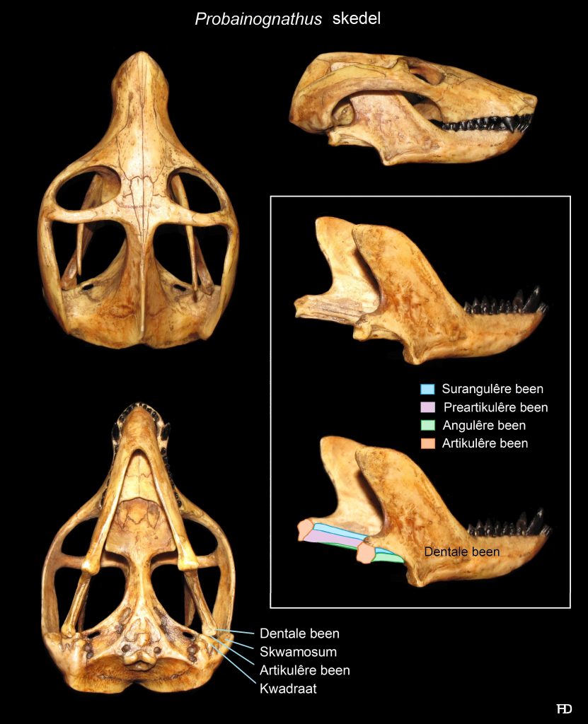 Sinapsiede het beide reptielagtige en soogdieragtige eienskappe en dus, om ons drang om goed in hokkies te pas, moes ons ‘n arbitrêre eienskap soos die middeloorbeentjies kies om ‘n onderskeid tussen die reptiele en soogdiere te probeer vind. Alhoewel dit ‘n feit is dat alle lewende reptiele (en voëls en amfibieërs) slegs die stiebeuel (stapes) in die middeloor het en alle soogdiere drie oorbeentjies – die hamer, aambeeld en die stiebeuel in die middeloor het, is daar fossiele wat selfs hierdie skynbaar eenvoudige reël oortree. En so moet dit wees as evolusie waar is. Die enigste manier hoe mens organismes in duidelike groepe kan verdeel is omdat die oorspronklike voorsate waaruit hulle evolveer het, uitgesterf het, want as hulle nog geleef het, sou mens net een kontinuum van organismes gehad het. Fossiele vernietig dikwels mense se simplistiese opvattings oor goed, omdat hulle juis ons netjies gekonstrueerde hokkies vernietig. Daar is ‘n paar probainognathiërs soos Diarthognathus wat ‘n dubbele gewrig tussen die onderkaak en die skedelbasis het, met ander woorde tussen die dentale been en die skwamosum, én tussen die artikulêre been en die kwadraat.