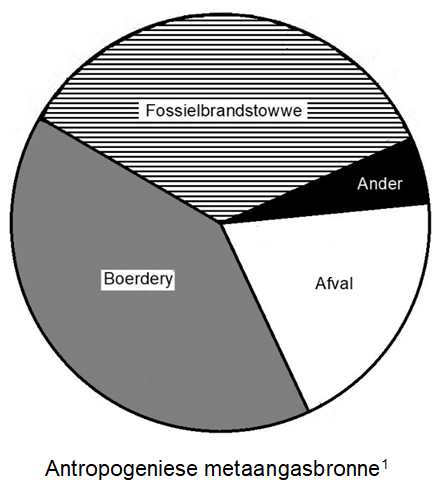 Ongelukkig bedoel dit ook dat die ekologie, in die gebied wat vir landbou gebruik word, vernietig word. Die plante en diere wat oorspronklik in ‘n gebied voorgekom het, word eenvoudig uitgewis wanneer die veld skoongemaak word vir die kweek van gewasse. Ongelukkig word die riviere, grondwater en die grond self oorbenut en met landbouchemikalieë vergif, wat ‘n veel groter gebied as die landbouarea ekologies impakteer4 5.Ongeveer 60% van metaangasvrystellings, word deur menslike of antropogeniese aktiwiteite veroorsaak. Drie tipes antropogeniese aktiwiteite dra tot meer as helfte van die metaangas, wat jaarliks in die atmosfeer vrygestel word, by. Die belangrikste bronne van antropogeniese metaangasuitlatings is: boerderyaktiwiteite (40%), fossielbrandstowwe (35%) en afvalhope en afvalwater (20%)6.