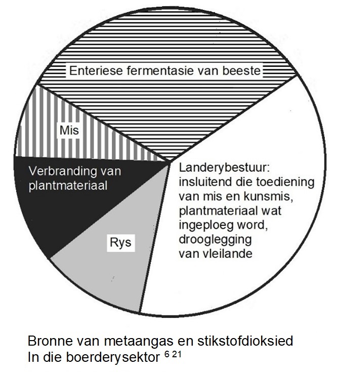 Boerderye is die bron van drie kweekhuisgasse: koolsuurgas, metaan en stikstofdioksied waarvan die een erger as die ander is. Metaangas se impak as kweekhuisgas is 28 keer groter as dié van koolsuurgas en stikstofdioksied se effek op die atmosfeer is 265 keer groter as dié van koolsuurgas7.