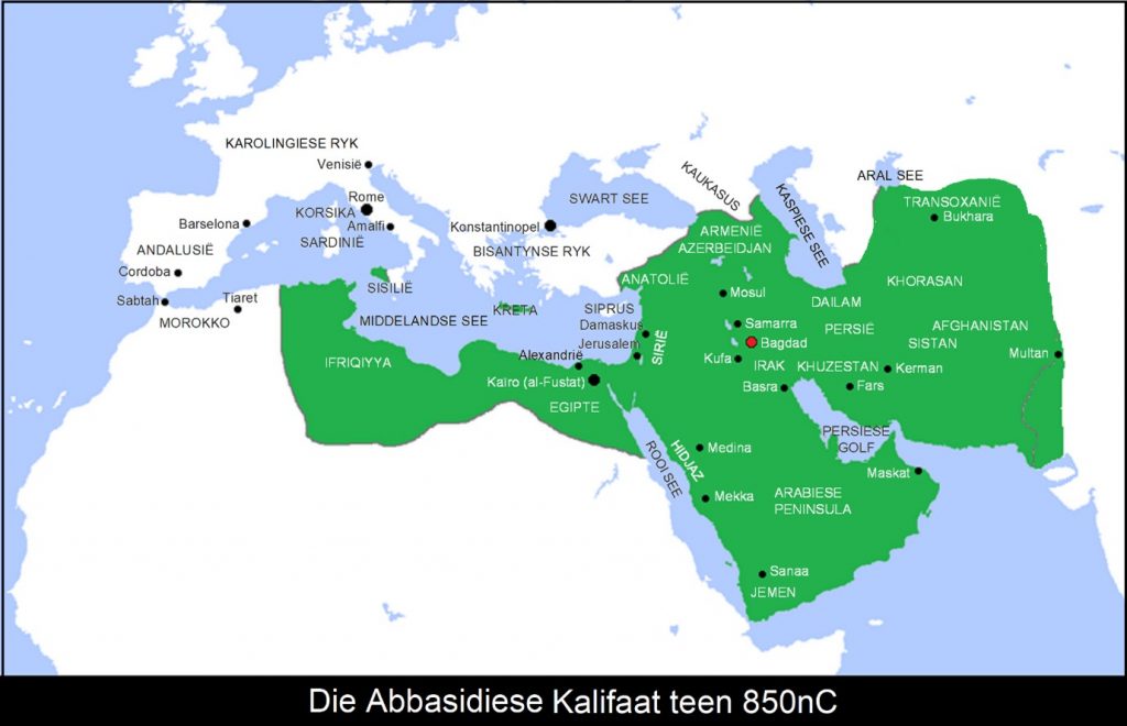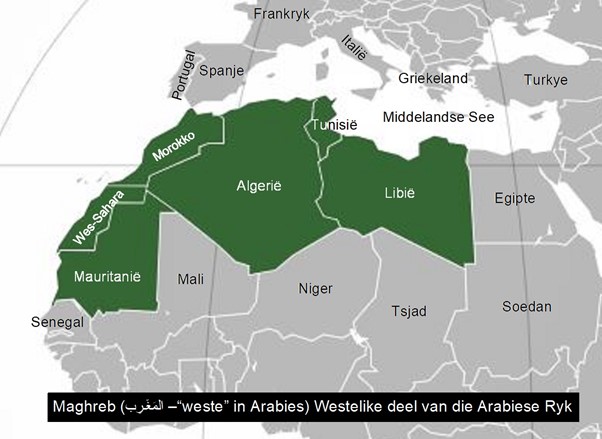 Die politieke grense van die lande het natuurlik nie in daardie tyd bestaan nie en was eers eeue later deur Europese lande, wat Noord Afrika tussen hulle opgedeel het, aangebring. Die oostelike deel van die Arabiese Ryk word terloops die Mashrek genoem as jy wonder, maar omdat dit nie deel van hierdie storie is nie gaan ek nie ‘n kaart daarvan insluit nie.