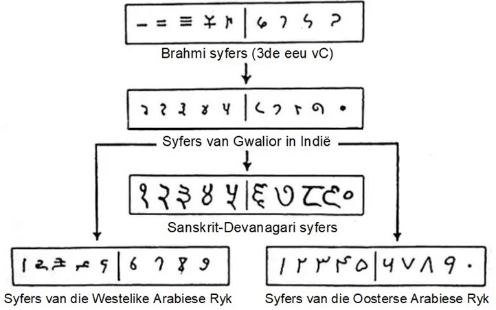 Toe die Arabiese Ryk tot by Indië gestrek het, het hulle ontdek dat die Hindoes onfhanklik ‘n baie gesofistikeerde wiskunde ontwikkel het. Hierdie wiskundige stelsel, wat die syfer 0 en getalle soortgelyk aan dié wat ons vandag gebruik, was in die Arabiese wiskunde opgeneem. Die woord syfer (“sifr” in Arabies) is die naam vir nul.