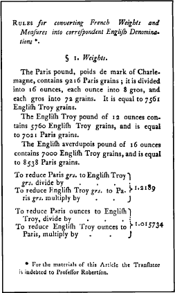 In 1789 publiseer Lavoisier die boek Traité élémentaire de chimie wat as die hoeksteen van moderne analitiese chemie beskou word. In die Engelse vertaling van Lavoisier se boek: Elements of Chemistry (1790), het die vertaler Robert Kerr, ‘n tabel vir die omskakeling van Franse mates na Engelse mates geplaas waar hy onse en greine na desimale van ‘n pond omskakel.