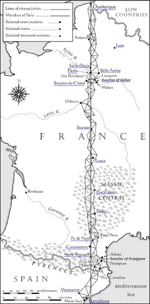 Die Franse meridiaan (wat deur die Franse voor die Engelse nulmeridiaan gebruik is) loop noord-suid deur Duinekerke op die noordkus van Frankryk, deur Parys en deur Barselona in Spanje. Die presiese breedtegradelesings tussen Duinekerke en Barselona was al vir lank bekend en as die afstand tussen hierdie twee punte presies gemeet kon word, kon mens die afstand van die noordpool tot die ekwator bereken – net soos wat Eratosthenes dit gedoen het toe hy die omtrek van die Aarde meer as twee duisend jaar vroeër bepaal het – maar hierdie keer met hoogs akkurate instrumente. Hierdie afstand, wat oorspronklik in lignes (‘n voor-revolusionêre Franse lengte) gemeet is, is deur 10 miljoen gedeel om vir ons die meter te gee. Die afstand van die ekwator tot by die Noordpool is dus 10 000 kilometer en die omtrek van die Aarde is dus 40 000 kilometer. Eratosthenes se berekening van 250 000 stadia, wat 40 008 kilometer is, was toe met 8 kilometer uit!