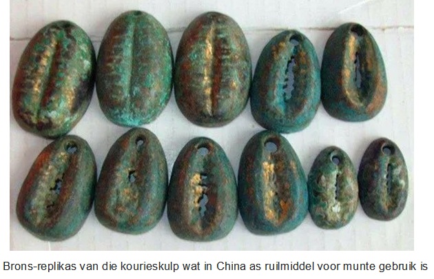 Die geldkaurie was van ten minstens 2 070-1 200 vC as ruilmiddel gebruik, maar dit was in die verafgeleê suidwestelike streek van China tot so onlangs as die 17de Eeu nC as ruilmiddel gebruik. Trouens die simbool wat vir geld of handel in Chinees gebruik word is: 貝 wat skulp beteken. Weens die tekort aan werklike skulpe het China onder die Shang Dinastie (1600-1046 vC) dit met brons replikas vanaf 1 200 vC BCE vervang. Dit was inderwaarheid die eerste metaal ruilmiddel in China en kan eintlik as die eerste munte beskou word, alhoewel dit nie soos die tradisionele plat, ronde skyfie wat ons met munte assosieër lyk nie.