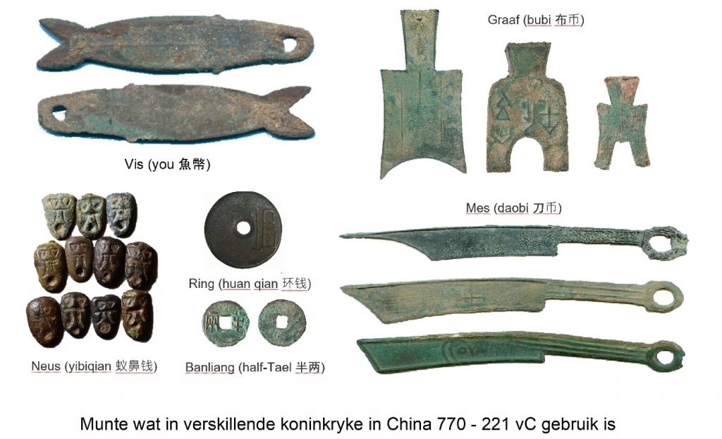 Oorloë tussen krygshere van verskillende streke het China van 770 vC tot 221 vC in verskillende koninkryke opgebreek en elkeen van hierdie agt streke het hul eie ruilmiddels van brons vervaardig wat onderskeidelik as die graaf, die mes, die ring, die neus en die banliang bekend gestaan het. Ek gaan dit hier munte noem want, ongeag die vorm daarvan, het dit basies dieselfde rol as munte gespeel.