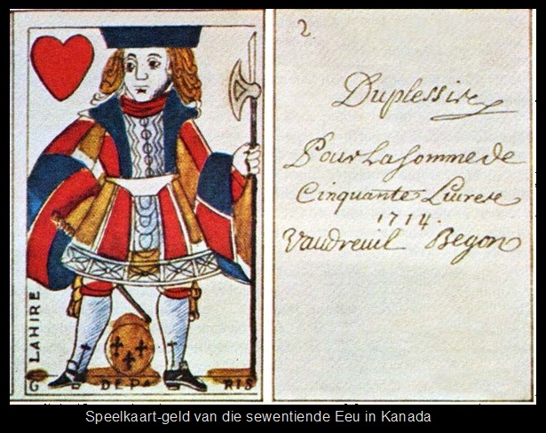In die sewentiende Eeu was bewerpelse as ruilmiddel in die Franssprekende deel van Kanada gebruik. Franse munte was al hoe meer in aanvraag soos wat die kolonie uitgebrei het, maar munte was skaars. Uiteindelik het hulle ‘n geldkrisis in 1685 bereik toe soldate hul lone moes ontvang, maar daar nie genoeg geld was om hulle te betaal nie. Jacques de Meulles, die hoof van finansies in die kolonie het toe ‘n slim plan beraam. Hy het al die speelkaarte van die soldate gekonfiskeer ‘n geldwaarde agterop geskryf en sy naam daar geteken. Hierdie kaartgeld is deur almal vanaf soldaat tot kruidenier aanvaar. Vir jare daarna, wanneer munte skaars geword het, het die kolonie weer na kaartgeld teruggekeer. Die kaartgeld was eers teen 1757 met banknote vervang.