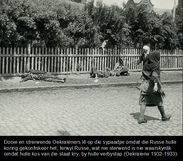 Die Holodomor is ‘n verskriklike ding wat in 1932-1933 gebeur het, maar amper niemand van weet nie, ten spyte van die feit dat dit in ‘n ontwikkelde land gebeur het, ten spyte daarvan dat daar kameras en koerante was. Die Russe het reeds toe besluit om die Oekraïeniërs uit te moor deur om eenvoudig al hulle koring te konfiskeer as belasting. Met ander woorde hulle het nie die Okraïense koringboere met geld te belas nie maar hulle produk – en in die proses hul saaikoring en hulle kos. Dit het tot die dood van ongeveer 7-10 miljoen Okraïeners gelei – wat niemand buiten Okraïeners herdenk nie.