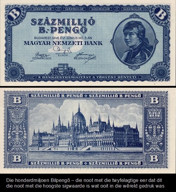 Die honderdmiljoen Bilpengő is ‘n noot van 100 000 000 000 000 000 000 Pengő werd was – kyk – daar is ‘n hele ses nulle meer as in die Zimbabwiese honderd triljoen dollar noot en is die Zimbabwiese honder triljoen dollar noot nie die noot met die grootste sigwaarde wat ooit gedruk is soos wat baie mense dink nie. Natuurlik het die Hongare geweet dat ‘n biljoen 1 000 000 000 000 is, en nie 1000 000 000 nie, want soos almal buiten Amerikaners en Zimbabwiërs weet, is 100 000 000 ‘n miljard en nie ‘n biljoen nie en dan is ‘n triljoen mos 1 000 000 000 000 000 000 en nie 1 000 000 000 000 wat ‘n biljoen is nie.