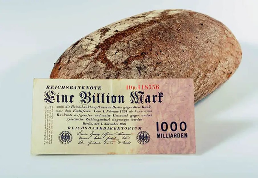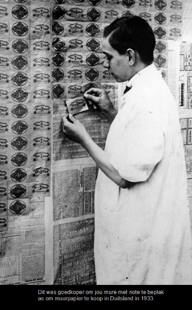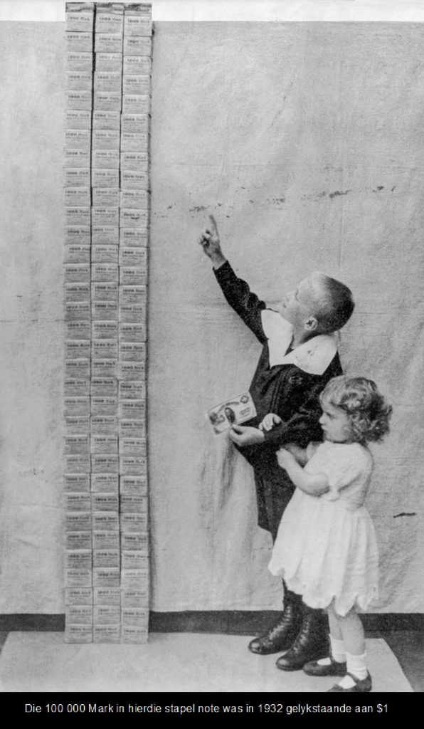 Op die hoogtepunt van die hiperinflase was een Amerikaanse dollar een triljoen Mark werd. In Januarie 1932 het ‘n brood 250 Mark in Duitsland gekos, teen die einde van die jaar het dit 200 miljoen Mark gekos, uiteindelik in 1933 het ‘n brood een biljoen (of soos die foto sê ‘n duisend miljard) Mark gekos.