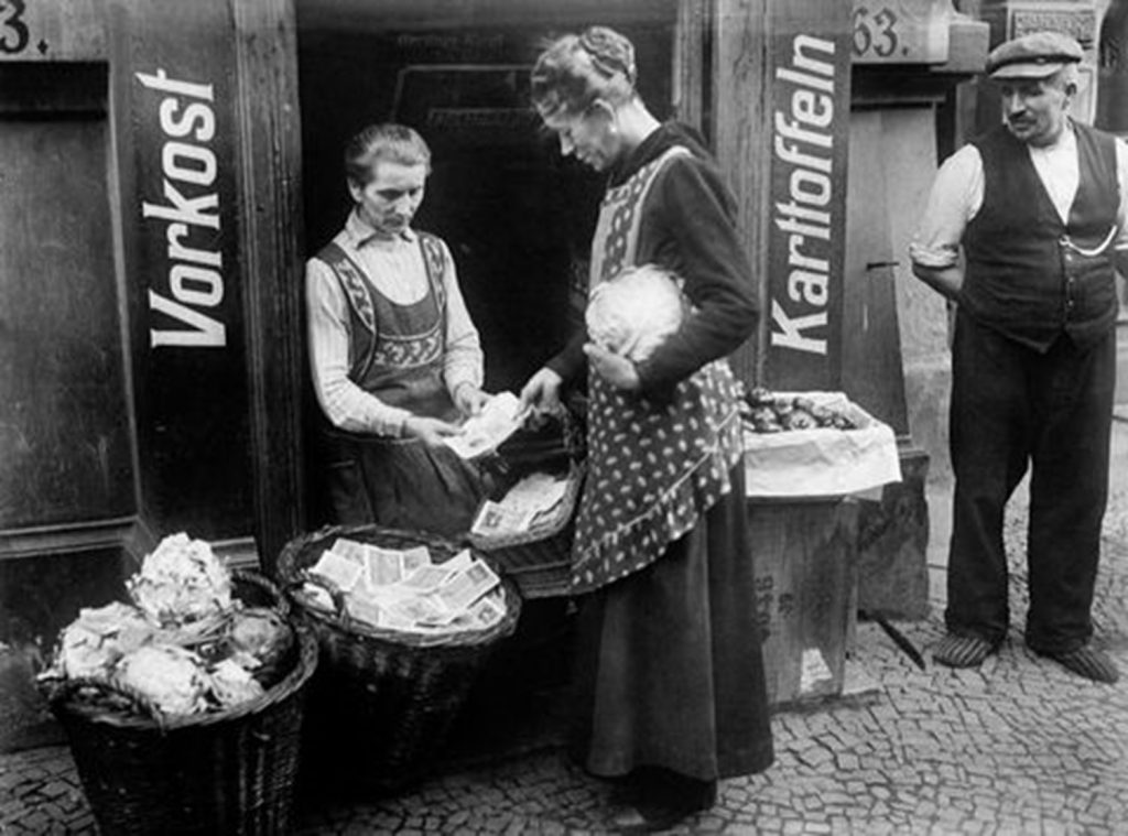 Hiperinflasie het ook in 1932-1933 in Duitsland onder die Weimar regering plaasgevind. Ironies is dit nie die ergste voorbeeld van hiperinflasie nie, maar daar was baie fotos ten tye van hierdie ramp geneem en dit is hoekom ek dit hier gebruik. Die hoofrede vir die hiperinflasie in Duitsland het reeds in 1921 na die Eerste Wêreldoorlog begin. Duitsland was verarm na die oorlog maar hulle moes ‘n bykomstige 132 biljoen goue mark aan die lande wat die oorlog gewen het as skadevergoeding betaal. Terselfdertyd was hulle deur hierdie lande gebiokot en het gesukkel om geld te kry om hulle skuld te betaal. Duitsland het toe oorsese geld teen enige prys aangekoop om hul skuldlas te delg wat hulle swak geldeenheid net verder verswak het. Soos hulle geldeenheid waarde verloor het, het die regering eenvoudig net nog meer note gedruk en sodoende hul geldeenheid net nog verder verswak.