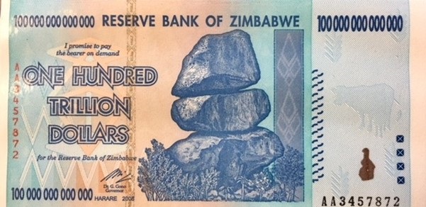 Die Honderd triljoen Zimbabwiese Dollar noot was ten tye van die uitreik daarvan omtrent R5 werd. Mens kan nie rykdom skep deur om meer geld te druk nie – iets wat die Zimbabwiese regering nie verstaan nie. Meer hieroor later.