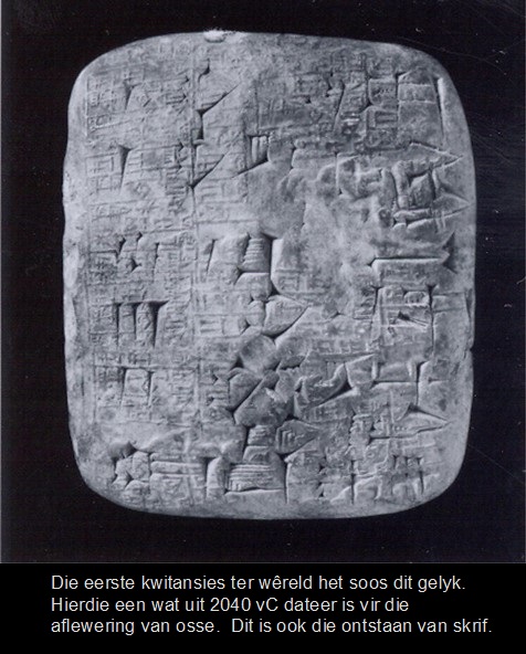 Verteenwoordigende geld het saam met die eerste stede in Sumerië ongeveer 3000 vC ontstaan. Boere het van hulle surplus gars of lewende hawe in die tempel, wat eintlik as ‘n skuur en mark gedien het en wat deur priesters bestuur is, gaan berg. In ruil het hulle ‘n kleitabletjie ontvang waar die waarde van hulle deponering aangeteken is. Hulle kon dan hierdie kleitabletjie gebruik om van hulle skuld aan die tempel (basies belasting) te vereffen of iets daarmee te koop of skuld te betaal. Aangesien gars die belangrikste boerderyproduk was, wat ook as stapelvoedsel gedien het, het dit die monetêre eenheid geword.