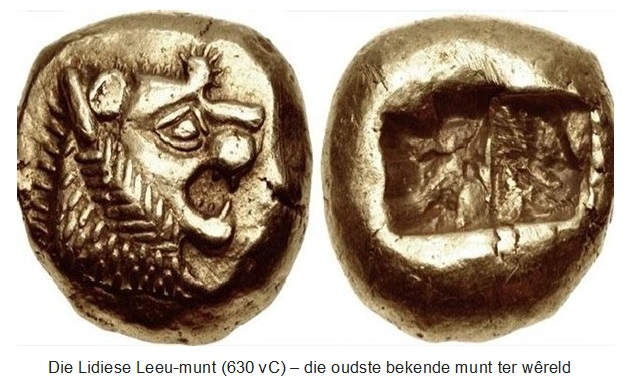 Van die oudste munte bekend, was deur die koning Aliattes van Lidië (deel van hedendaagse Turkye), gedurende die einde van die 7de Eeu vC gebruik. Hierdie tipe munt wat uit elektrum, ‘n natuurlike allooi van silwer en goud vervaardig is, staan as die Lidiese Leeu bekend weens die feit dat die leeu wat die simbool van die koningshuis van Lidië was op die een kant van die munt uitgebeeld word.