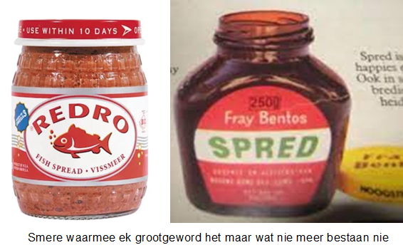 Ontbyt was ‘n stewige affêre met eiers en spek of boerewors en natuurlik mieliepap. Ons het bokspap net oor die naweek kon eet – maar ook net aan die begin van die maand want my ma moes haar inkopiebegroting knyp tot “Jan van Riebeeck se oë traan”. Skoolkos was maar effentjies – in die jare voor snoepies was dit maar twee (of vier – as jy gekla het dat jy die vorige dag honger was) snye brood met regte botter (ons het van die staanspoor teen margarien standpunt ingeneem) met Marmite, Bovril, Fray Bentos, Redro of tuisgemaakte konfyt en ‘n vrug – ‘n appel, lemoen, of ‘n perske uit die tuin, maar geen koeldrank nie – daar is water in die Vaaldam en dit kom uit die kraan.