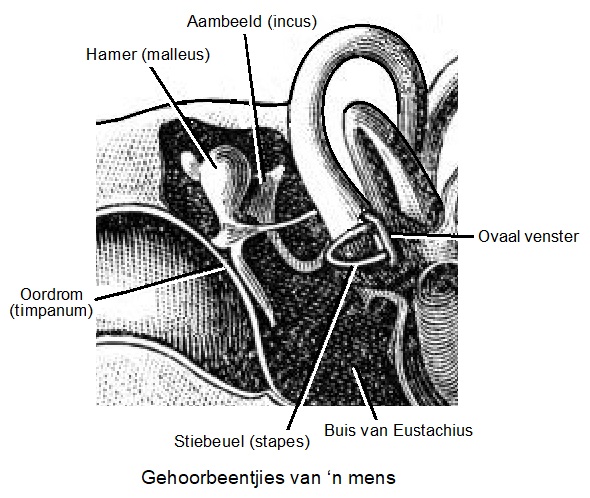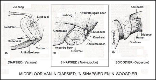 Soogdiere het egter ‘n unieke middeloor met drie gehoorbeentjies – die hamer (malleus), aambeeld (inkus) en stiebeuel (stapes). Maar die ekstra twee gehoorbeentjies moes iewers vandaan gekom het. Gelukkig het ons duisende soogdieragtige reptiel fossiele wat hierdie raaisel opgelos het. Soogdieragtige reptiele of sinapsiede het ongeveer 280-200 miljoen jaar gelede geleef.