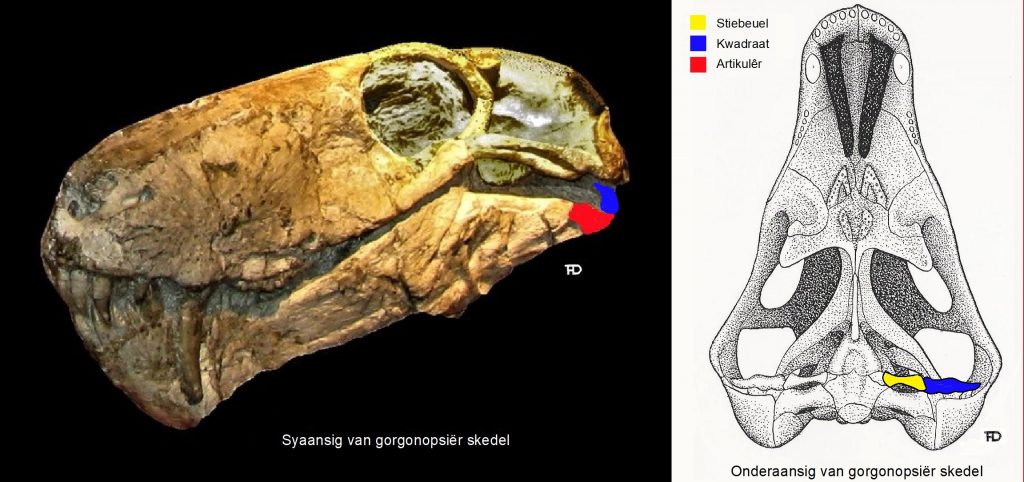 Vir ‘n in-diepte dekking van die ontstaan en evolusie van soogdieragtige reptiele besoek Die ontstaan van soogdiere. In hierdie artikel bespreek ek in detail die herkoms van die hamer en aambeeld van die soogdier vanuit die artikulêr en die kwadraat wat die reptiel se kaakskarnier vorm.