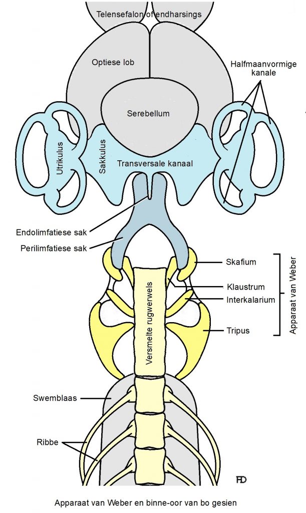Terug na die visse: visse kan inderdaad hoor en meeste visspesies maak selfs geluide om met mekaar te kommunikeer (Rice et al., 2022). Net omdat jy nie die geluide in water kan hoor, omdat jou ore in lug funksioneer, bedoel dit nie dat waterlewende diere stom of doof is nie. Visse het bloot nie buite-ore nodig om te hoor nie want klank beweeg nog meer effektief deur vloeistof as lug en word deur die liggaamswand en weefsel van die vis na die swemblaas vervoer. Klankgolwe wat deur die vis se weefsel trek laat die swemblaas vibreer. Hierdie vibrasies word na die beentjies van die Apparaat van Weber (wat in 1820 deur Ernst Weber ontdek en beskryf is) oorgedra, wat die lagena van die binneoor, waaraan die gehoorsenuwee gekoppel is, prikkel.