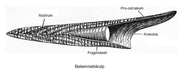 Die belemnietskulp is uit drie dele opgemaak – die agterste spiesvormige rostrum wat uit meeste in die fossielrekord gevind word – omdat die dunner middelste en voorste dele maklik afgebreek het en dus nie gefossileer het nie. Die middelste fragmokeël waar die luggevulde kamers geplaas was word deur die voorste tongvormige deel, die pro-ostrakum waar die kop en tentakels uitgesteek het opgevolg. Die alveolus is die kamer waarbinne die liggaam van die belemniet gesetel was. Die rostrum was uit kalsiet en die fragmokeel en pro-ostrakum was uit aragoniet opgemaak.