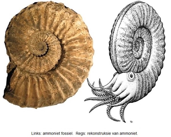 Ammoniete het in die Devoon Periode verskyn en belemniete het in die Laat Trias Periode verskyn en teen die Mesosoïkum Era was beide groepe wêreldwyd volop in die oseane gewees. Beide groepe het saam met die dinosauriërs en talle ander groepe oerdiere tydens die KT meteoritietimpak en gepaardgaande uitwissingsgebeurtenis, 65 miljoen jaar gelede, verdwyn.