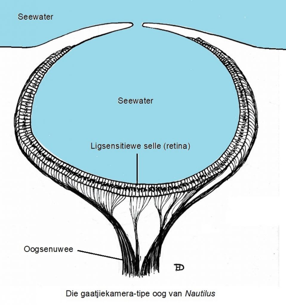 Die nautilus-koppotiges het ‘n primitiewe tipe oog wat soos ‘n sakkie met ‘n opening na buite lyk. Die opening laat water van buite die oog vul. Die oog van hierdie koppotiges werk soos ‘n bokskamera wat toelaat dat die lig deur die gaatjie na binne tot op die retina skyn. Lig word met behulp van die gaatjie-pupil eerder as deur ‘n kornea of lens op die retina gefokus. Die beeld wat sodoende op die retina gevorm word, is baie dof.