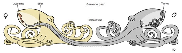 Bevrugting vind plaas wanneer die mannetjie pakkies spermselle of spermatofore in die wyfie se mantelholte met ‘n spesiale tentakel, wat die hektokotilus genoem word, plaas. In sommige gevalle kom die hektokotilus tydens paring vanself los, in ander gevalle ruk die wyfie die hektokotilus af en druk dit self in haar mantelholte in, in sommige gevalle, as die mannetjie nie ‘n wyfie vind nie, sal hy sy eie hektokotilus afruk wat dan self deur die water swem en op chemiese seine reageer om ‘n wyfie te probeer vind om te bevrug voor dit vrek. In alle gevalle sal die mannetjie vrek na sy hektokotilus afbreek.