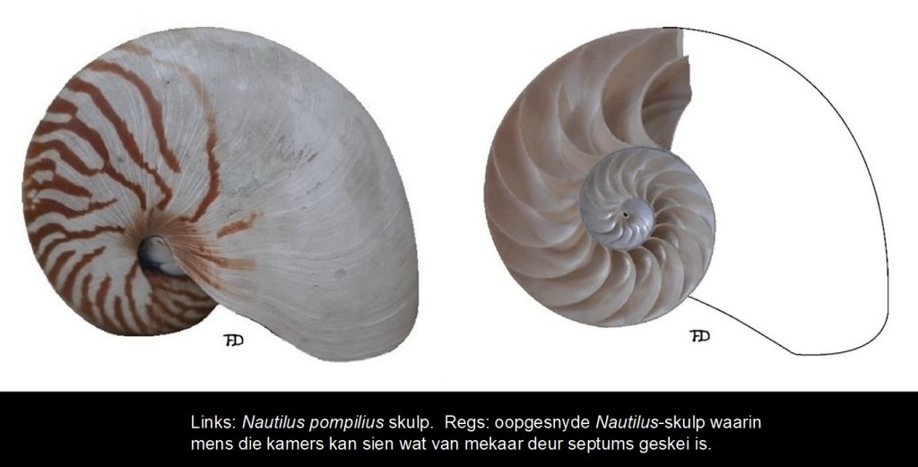 Daar is 30-60 kamers in die volwasse Nautilus skulp. Die grootste voorste kamer word die woonkamer genoem en dit is waar die dier se liggaam voorkom (die woonkamer in die voorbeeld in die foto hieronder regs, is afgebreek). Soos wat die dier groei, word die skulp, wat deur die mantel rondom die kop afgeskei word, al hoe groter, terwyl ‘n nuwe septum aan die agterkant van die woonkamer gevorm word, terwyl die liggaam vorentoe in die groter deel van die skulp skuif. Die kleiner kamers agter die woonkamer is met stikstof (van ammonium wat as afvalstof vervaardig word) gevul en die kamers direk agter die woonkamer is met water gevul. Die dier kan sy vertikale posisie in die waterkolom handhaaf deur om die volumes van water en gas in die kamers te beheer. Klein pypies of sifons, waardeur die water of gas gepomp word, verbind naasliggende kamers met mekaar.