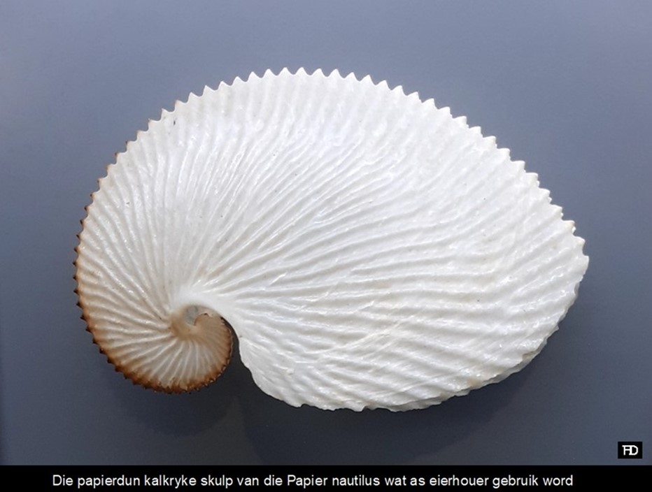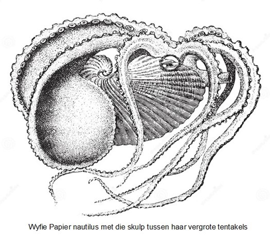 Die boonste breë tentakels, waarmee die skulp gebou word en die skulp mee vasgehou word, kom slegs in die wyfies voor. Die skulp word deur die punte van hierdie breë tentakels afgeskei voor sy die eiers daarbinne lê. Gewoonlik sien mens die wyfie met haar kop en tentakels wat voor by die bek van die skulp uitsteek, maar sy sal dieper in die skulp intrek en ‘n silwer flits afgee wanneer sy bedreig word.