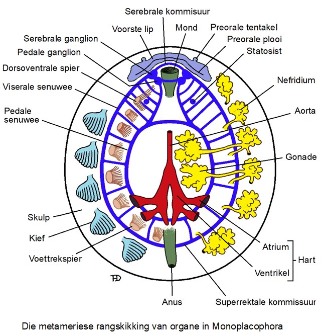 Hierdie herhaling van organe is nie uniek aan die monoplakofore nie en word ook in kewerslakke en protobrangiese tweekleppiges en die koppotige Nautilus aangetref. Nautilus het twee pare voetspiere, niere, kiewe en atria. In monoplakofore is daar nul tot twee pare aurikels, drie tot ses pare kiewe en drie tot sewe pare niere. Daar is agt skulpplate in kewerslakke en hul het verskeie pare voetspiere en kiewe.