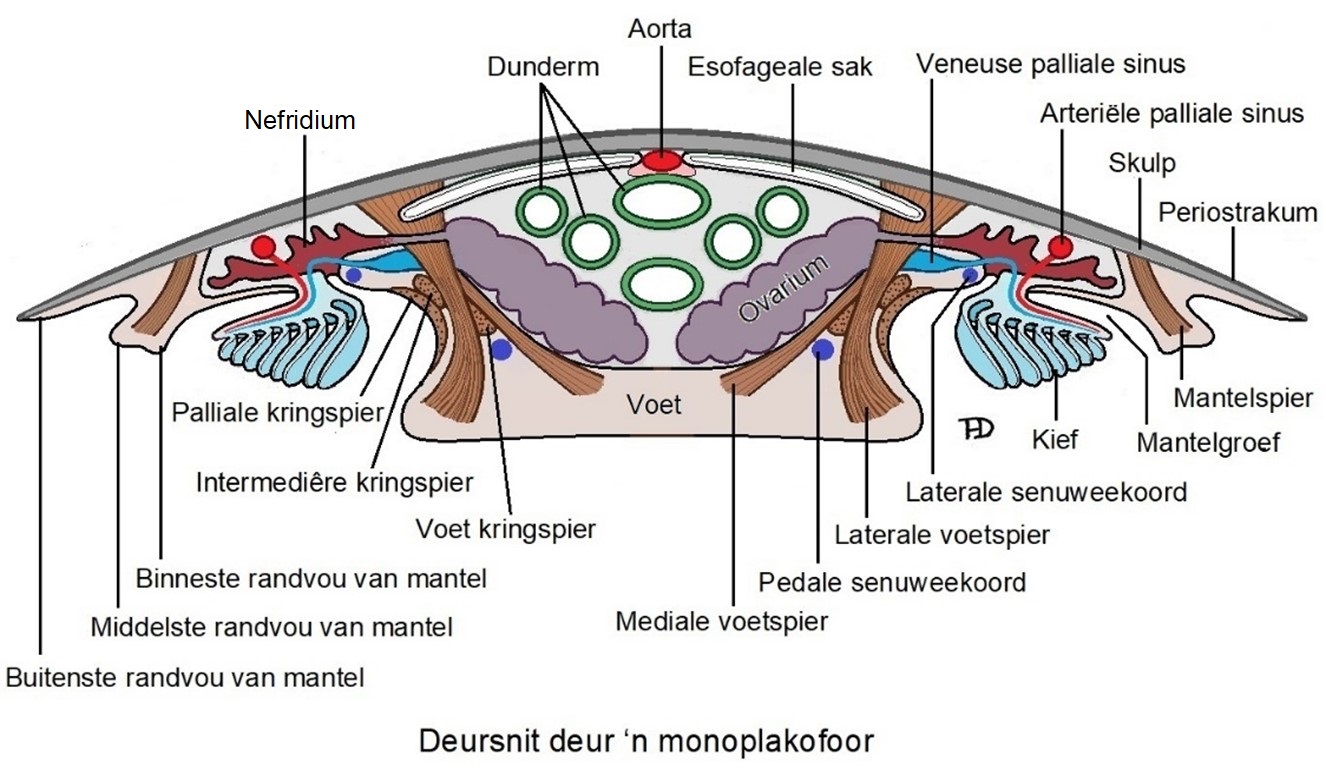 Monoplakofore verskil anatomies heeltemal van buikpotiges, maar kom in baie opsigte met kewerslakke ooreen. Monoplakofore het, soos die kewerslakke, agt paar series, of segmentaal-gerangskikte, dorso-ventrale spiere, wat ek hier voetspiere noem, wat die skulp aan die lyf vasanker. Die senuweestelsel van monoplakofore is soos dié van die kewerslakke, baie eenvoudig en daar is klein ganglions of ganglionsa in die kop, waarteenoor die ganglionsons van buikpotiges en veral koppotiges heelwat groter is en in laasgenoemde ‘n brein vorm.