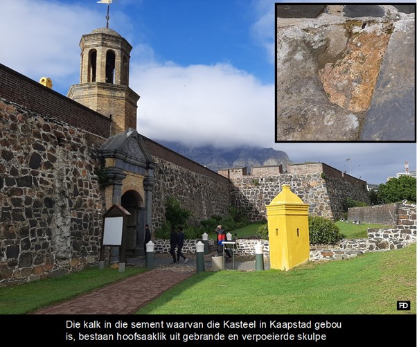 Hierdie skulpe was in oonde gebrand en tot kalkpoeier fyngestamp. Oorspronklik het die see met hoogwater teen die Katzenellenbogen bastion gebreek. Die vernietiging van die plante wat die duine stabiliseer met hierdie skulpmynery het egter veroorsaak dat die duinsand mettertyd in die hawe ingespoel het, en is die rede hoekom die Kasteel daarna honderde meter van die see was en die woude van Houtbaai, waarvan die hout onder andere vir die oonde gebruik was, nie meer bestaan nie. Kalk wat deur bannelinge op Robbeneiland gemyn was, was ook in kalkoonde op Robben Eiland gebrand en verpoeier.