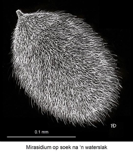 Die mirasidium, wat met ‘n dik siliumlaag bedek is, swem aktief rond op soek na die regte slak om te parasiteer. Die mirasidium moet binne 24 en 48 uur ‘n gasheer vind anders raak sy energie op en sal dit vrek. Wanneer die mirasidium die geskikte tussengasheer vind, word gom by die voorste punt – die apikale papilla – afgeskei terwyl die apikale papilla binnetoe stulp om ‘n suier te vorm wat saam met die gom aan die gasheer se vel vassuig. Ensieme word dan rondom die aanhegtingspunt afgeskei, wat die gasheer se weefsel begin verteer en ‘n gat in die slak se vel vorm.