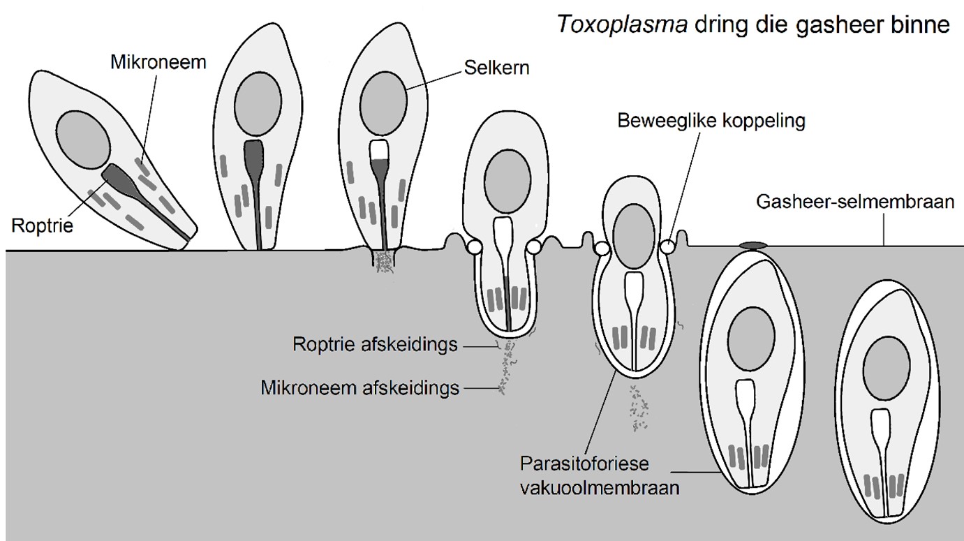 Die Toxoplasma tagisoïet druk homself tussen 24 tot 40 sekondes deur die opening van die beweeglike koppeling, binne die gasheer in.  Wanneer die parasiet die gasheersel binnedring, vervaardig die parasiet met behulp van die beweeglike koppeling en proteïene van die digte granules vanuit die gasheer se selmembraan, ʼn omhulsel rondom homself.  Hierdie beskermende membraan (die parasitoforiese vakuoolmembraan) is daar om die gasheer te flous deur te verhoed dat die gasheer se verdedigingsmeganismes die parasiet kan identifiseer en aanval.  Hierdie truuk stel die parasiet in staat om, soos sekere organelle soos die plastiede en mitochondria en die flagellum wat oorspronklik vanuit bakterieë ontstaan het, binne die sel te oorleef en daar te voed en voort te plant.  Plastiede, mitochondria en die basaalkorrel word juis deur ʼn soortgelyke gasheermembraan omring wat hulle in staat stel om binne die sel te oorleef.