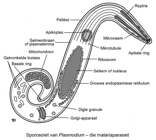 Plasmodium het, nes ander Apicomplexa, strukture soos roptrieë, mikroneme, mikrotubuli en gespesialiseerde proteïene wat hulle in staat stel om die gasheerselle te herken, aan dit vas te heg en dit binne te dring, en poolringe, ʼn enkele groot mitochondrion en mikrotubules onder die selmembraan.