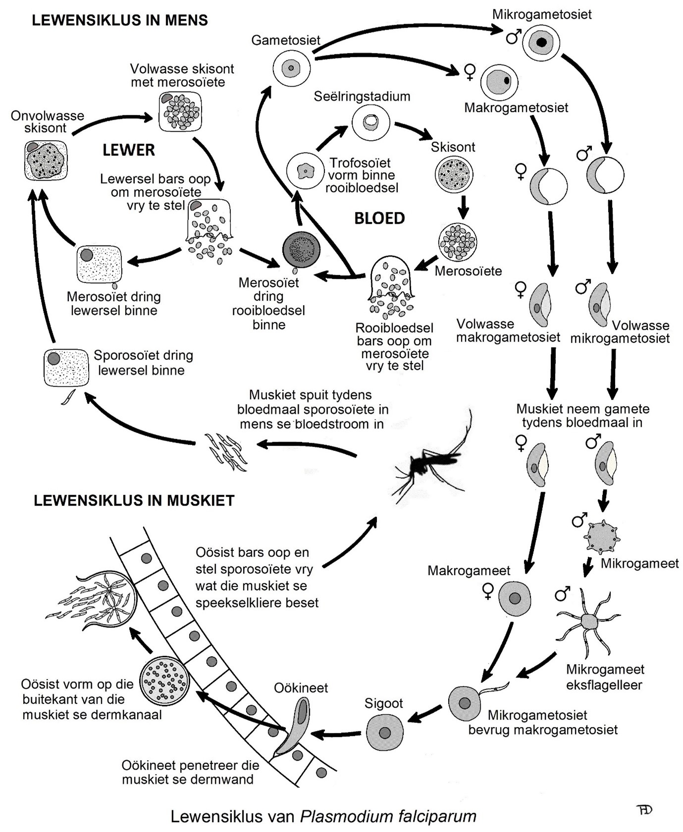 Slegs ʼn klein persentasie van merosoïete gee oorsprong aan manlike en vroulike gametosiete wat geslagtelik voortplant.  Die Plasmodium gametosiete word deur muskiete tydens hul bloedmaal tot in hul dermkanaal opgesuig.  Die manlike gametosiete bevrug die vroulike gametosiete en vorm sigote binne die muskiet se dermkanaal.  Die sigote verander vorm en gee oorsprong aan oökinete wat die wand van die muskiet se dermkanaal deurdring en dan aan die buitekantste deel van die dermkanaal vasheg en in ʼn oösist verander.