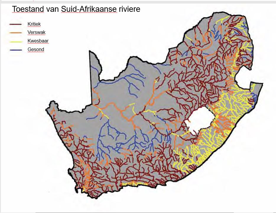 Ongelukkig is die waterkwaliteit in die bietjie water wat nog in die riviere voorkom, in groot dele van ons rivierstelsels hoofsaaklik deur landbouchemikalieë ondrinkbaar gemaak. Rondom nedersettings is die watergehalte verder verswak deur die toevoeging van rou riool en farmaseutiese middels en naby myne deur die instroom van suurmynwater en swaar metale.