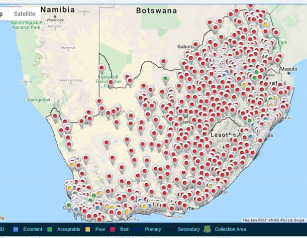 As mens egter na die Departement van Water en Sanitasie se inligting wat hulle in 2021 op hul webwerf gehad het, kyk, sal mens sien dat die 56% van wanbestuur en verval, ‘n gruwelike wanvoorstelling is. By verre die meerderheid van watersuiweringswerke werk volgens hulle nie soos mens op die kaart hierbo wat hulle self op hul webwerf geplaas het, kon sien.