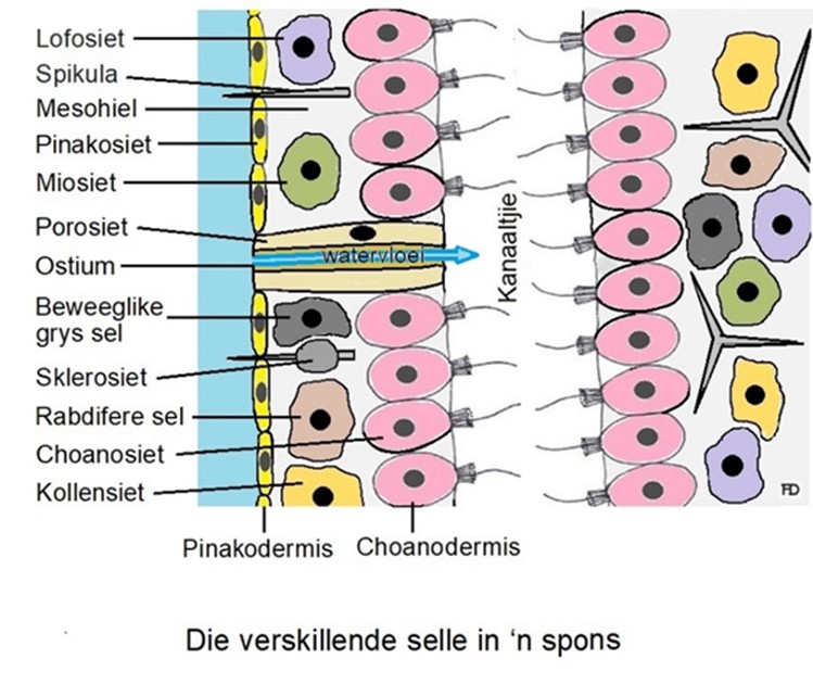 Sponse se liggame is vol kanaaltjies en porieë waardeur water in- en uitvloei. Die buitenste openinge word ostiums genoem. Die kanaaltjies en ruimtes binne die spons word met ‘n sellaag van kraagselle uitgevoer. Hierdie sellaag word die choanodermis genoem. Kraagselle of choanosiete is selle met ‘n kraag van trilhare of silia rondom ‘n lang sweephaar of flagellum. Die beweging van die sweephare veroorsaak die stroom water wat deur die spons se liggaam deur die ostiums en kanaaltjies beweeg, wat uiteindelik in die sentrale holte binne die liggaam, die spongoseel, vloei.