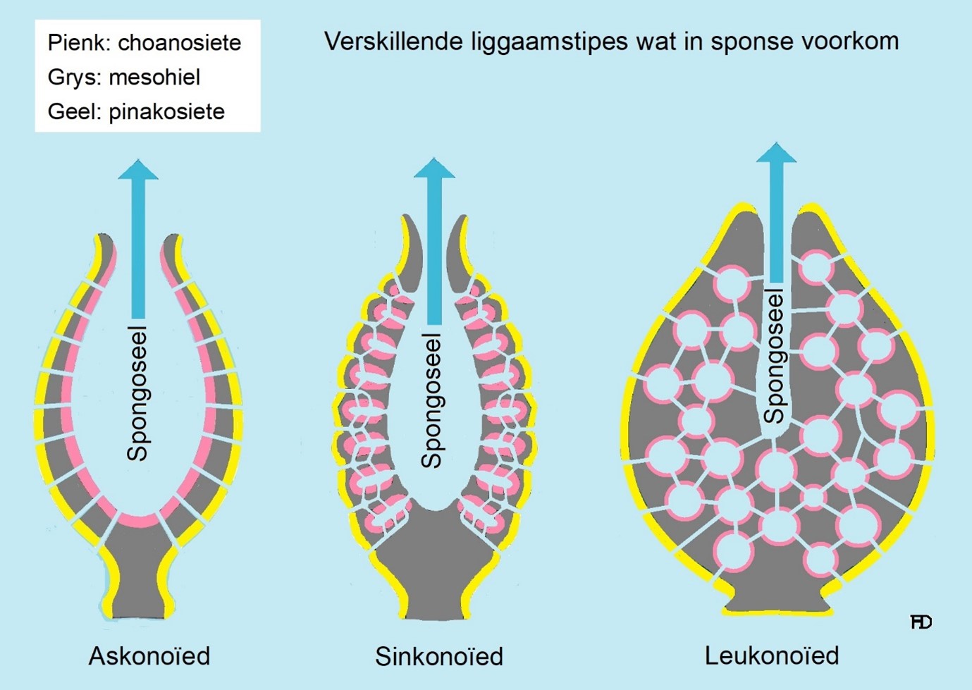 Die eenvoudigeste liggaamstipe wat in sponse voorkom is ‘n buis- of vaasvorm waarin die kraagselle as ‘n enkele laag rondom die sentrale spongoseel voorkom, wat die askonoïede liggaamstipe genoem word. Hierdie liggaamstipe veroorsaak dat die organisme besonder klein (gewoonlik onder 1 mm breed) en eenvoudig is. Die feit dat die laag selle ‘n beperkte oppervlakke bedek inibeer die organisme se vermoë om groter te word aangesien die voedsel en suurstof wat die organisme nodig het om groter te word en te metaboliseer, deur die kraagselle bepaal word – wat slegs tot die binneste oppervlakte rondom die spongoseel beperk is.